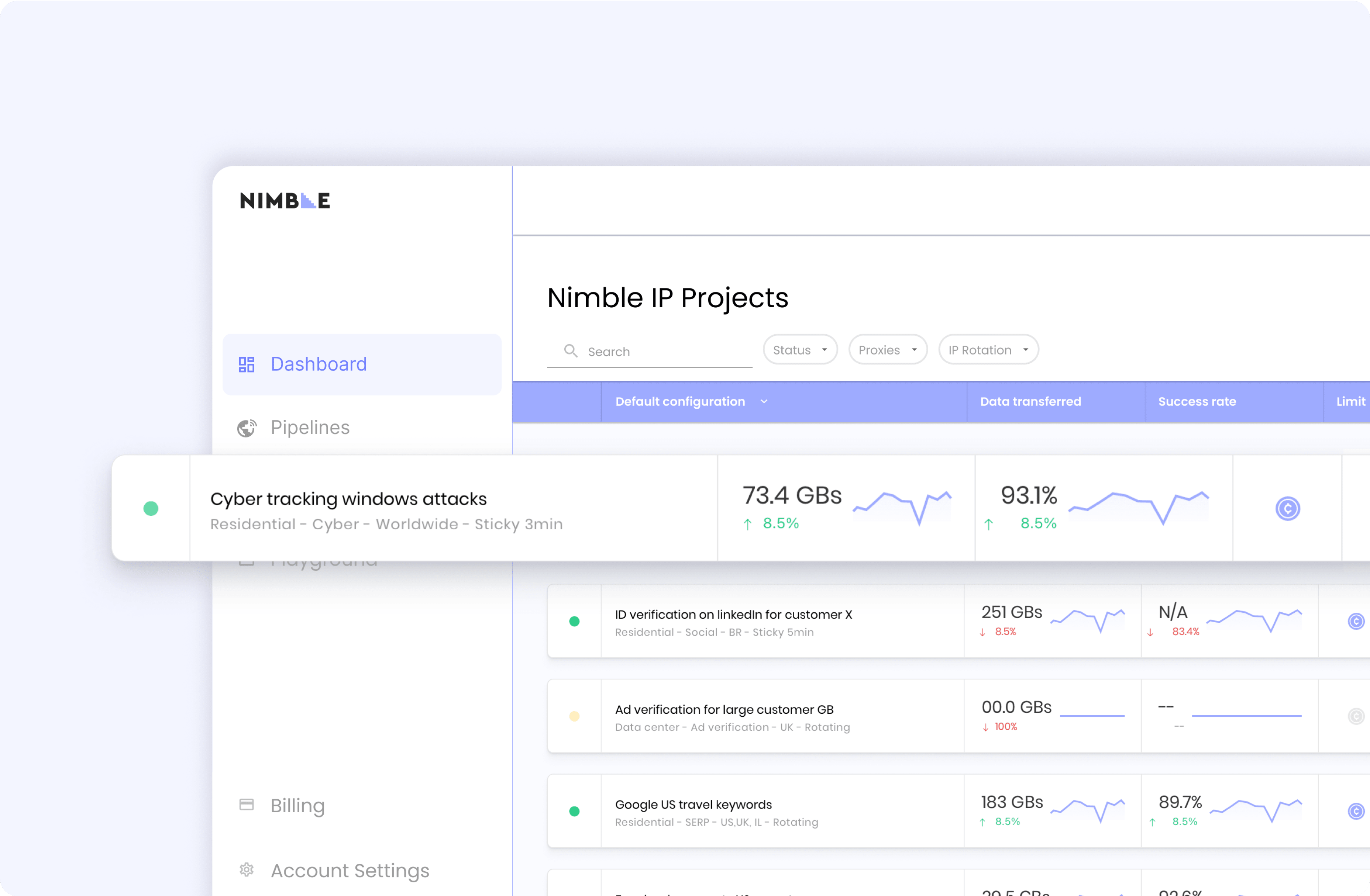 We created a cutting-edge Platform for Nimble, the ultimate solution for businesses seeking seamless web data pipeline management. The platform revolutionizes how the users monitor their diverse projects, offering insights into data transfer volumes, request metrics, error rates, and crucially, the top domains and countries utilized in their projects. Our team meticulously crafted a host of compelling data visualizations and graphs, empowering Nimble’s clients to make data-driven decisions effortlessly. With a user-friendly interface and the ability to filter using a multitude of data points, the dashboard encourages the users to dive deep into their data. Nimble’s satisfaction is a testament to our commitment to delivering a tool that not only simplifies pipeline management but also elevates their ability to fine-tune and optimize their operations for the best results.